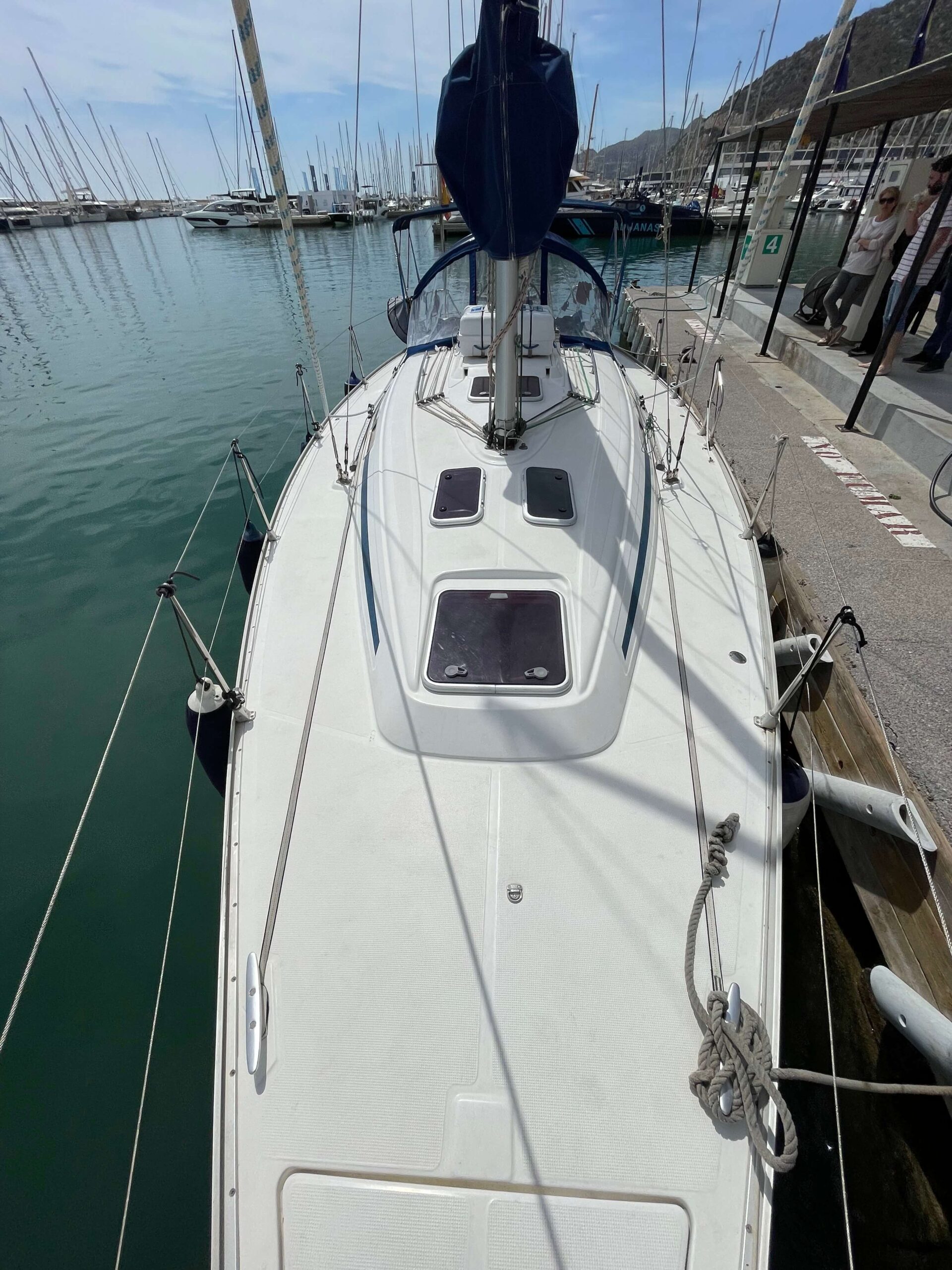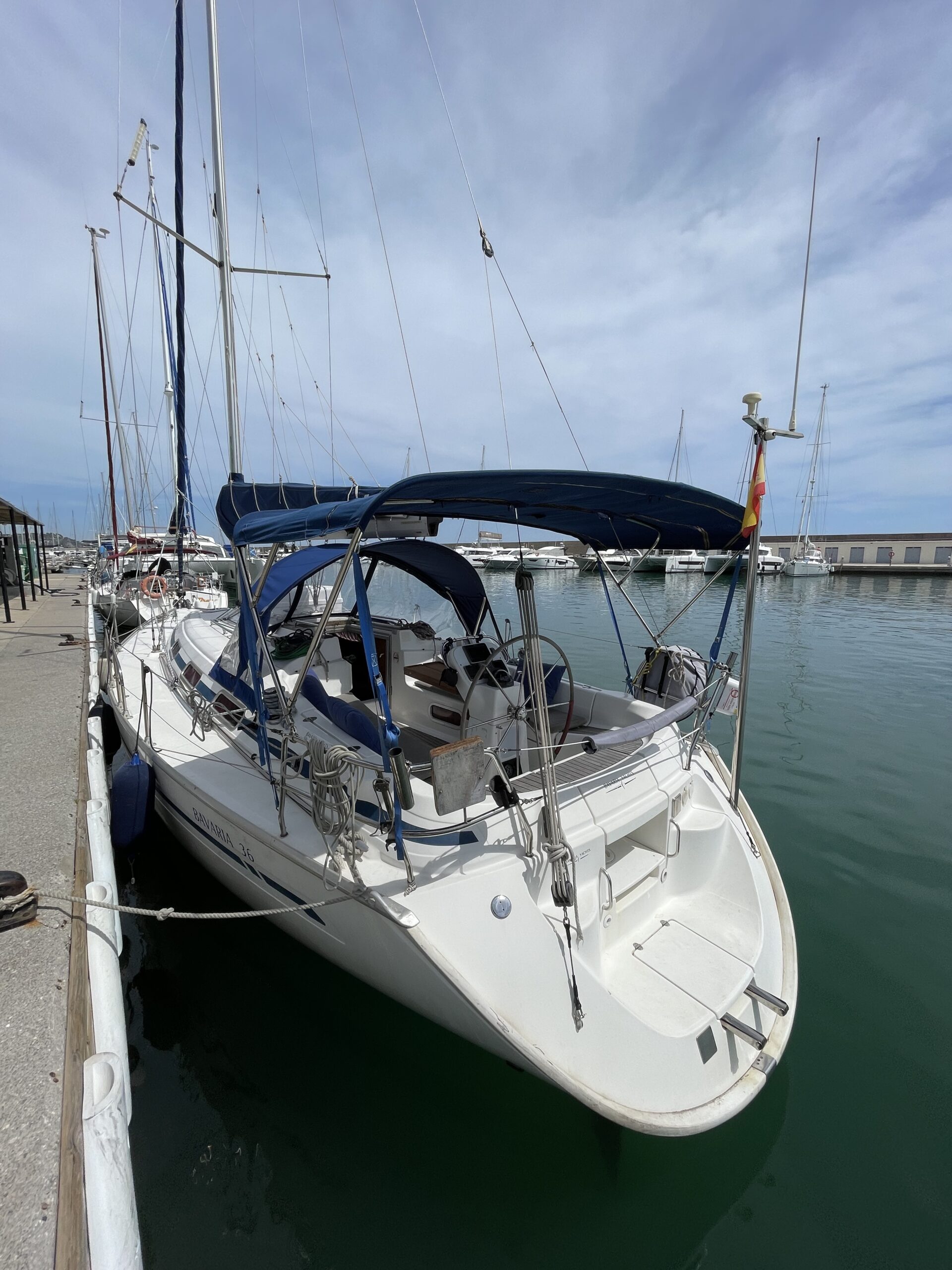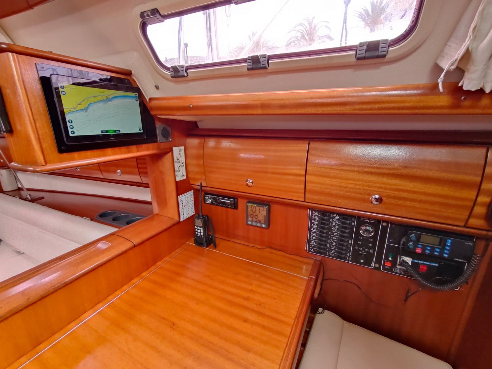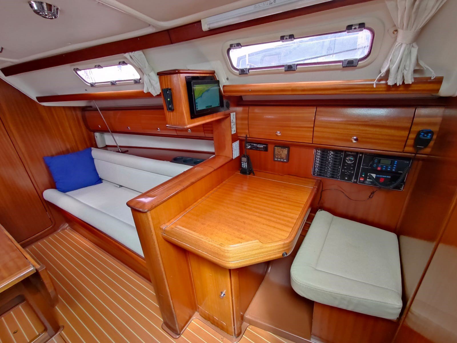 Velero de 11 metros de eslora con 3 camarotes y un baño, para navegar y pernoctar 8 personas cómodamente. Equipado con piloto automático, plotter en bañera, equipo de viento, sonda, AIS, VHF, radio con altavoces en interior y en bañera, cocina de gas basculante, molinete del ancla eléctrico con mando en cofre y en pulsador en bañera. Mayor con lazy-bag y con toda la cabuyería reenviada a bañera.