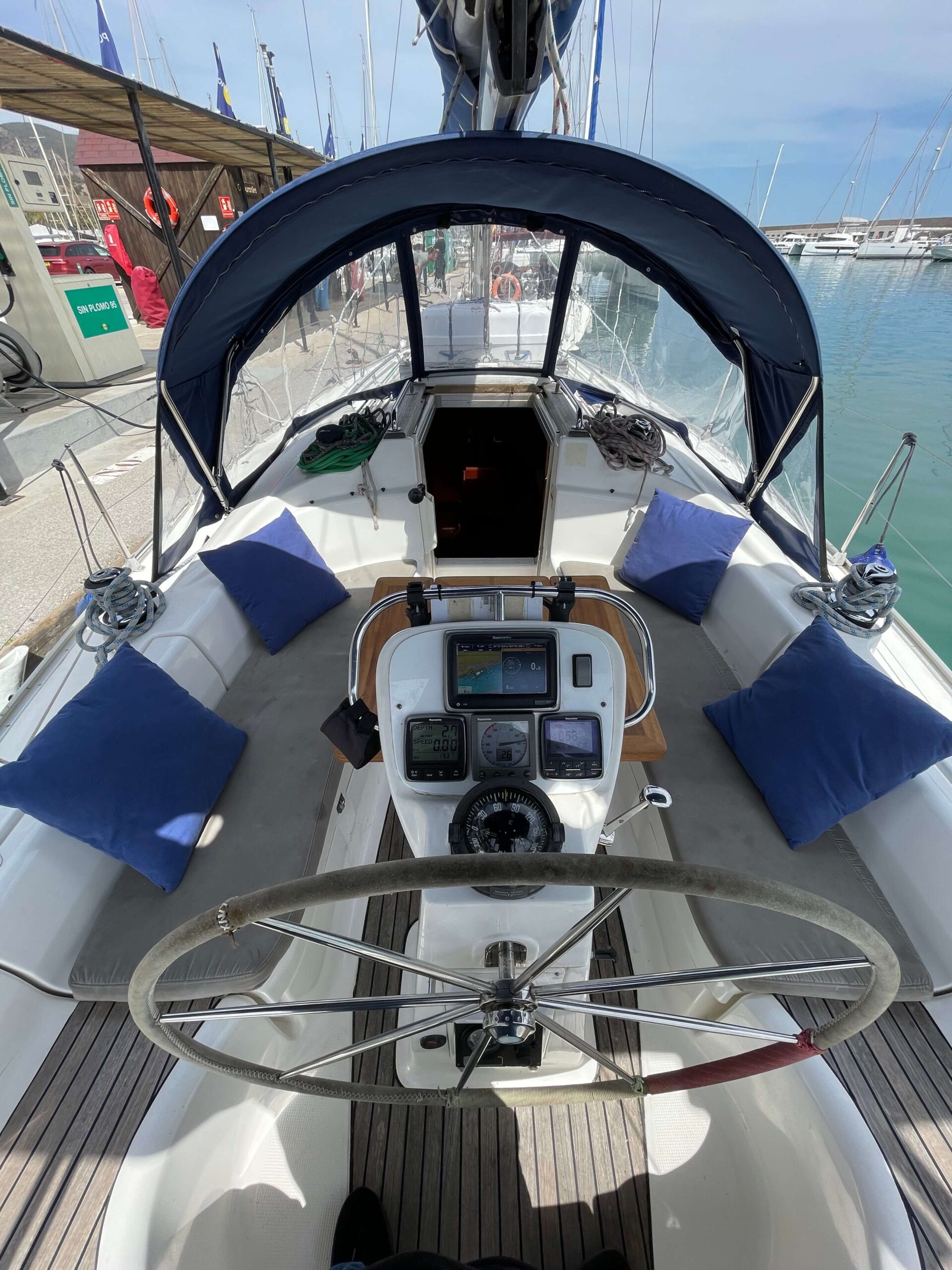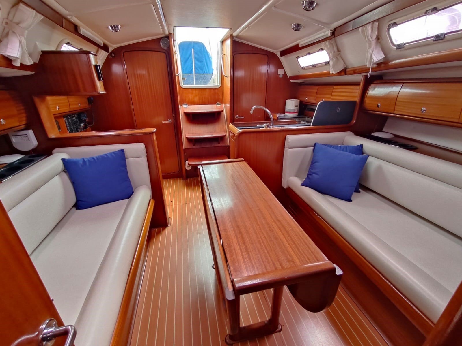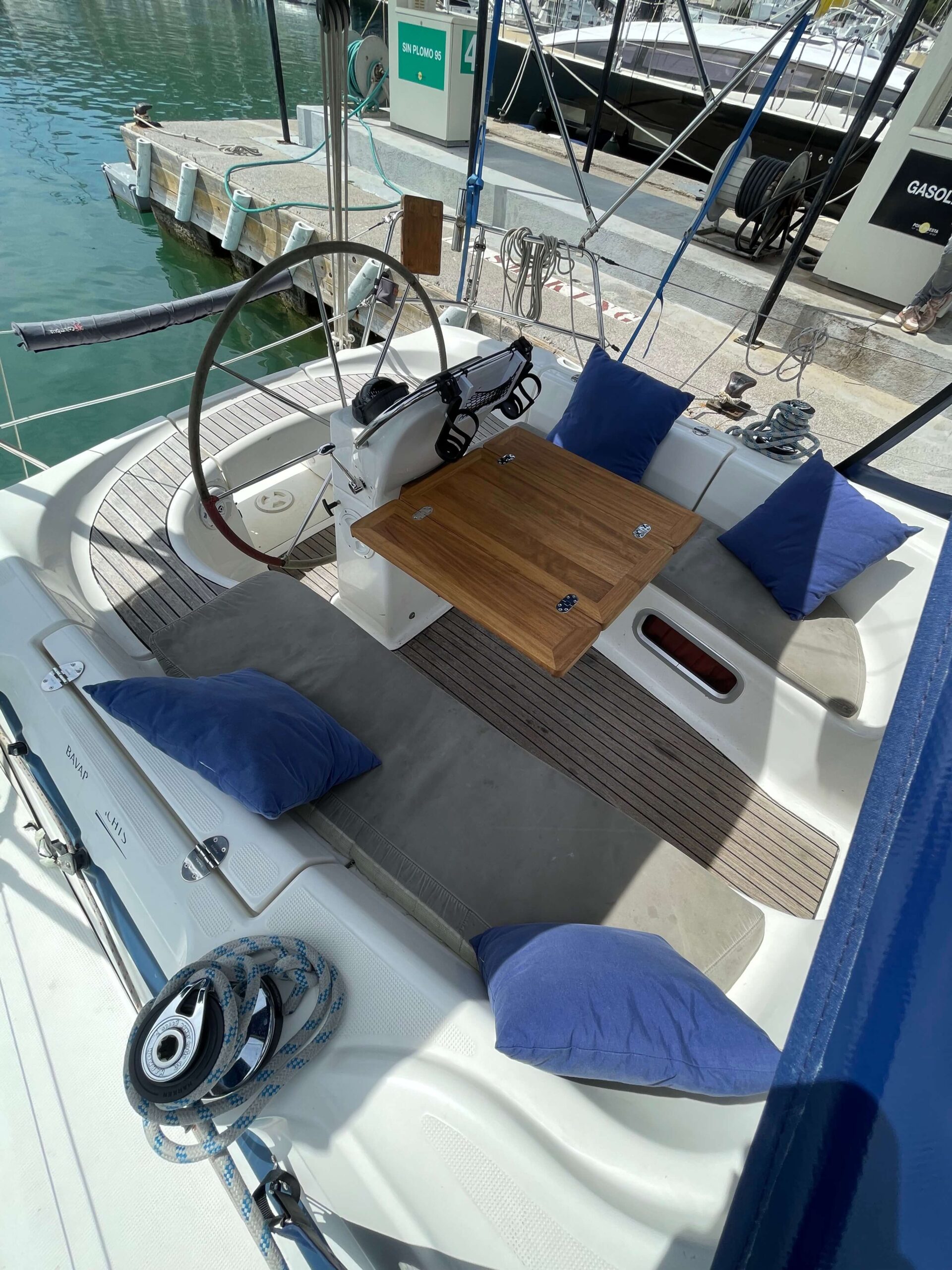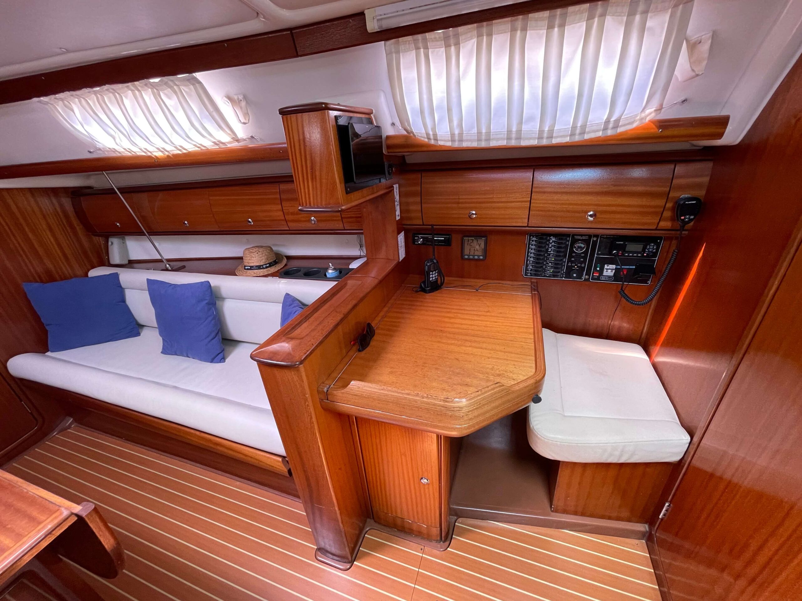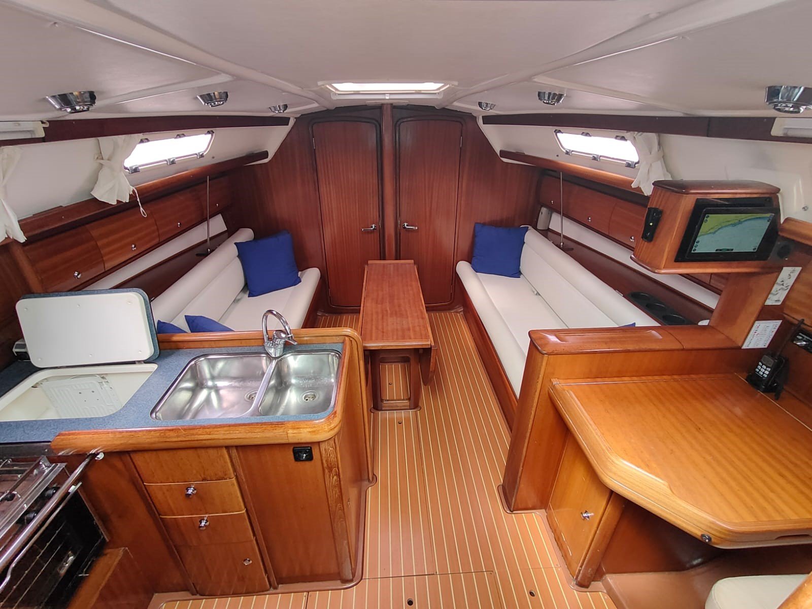 Velero de 11 metros de eslora con 3 camarotes y un baño, para navegar y pernoctar 8 personas cómodamente. Equipado con piloto automático, plotter en bañera, equipo de viento, sonda, AIS, VHF, radio con altavoces en interior y en bañera, cocina de gas basculante, molinete del ancla eléctrico con mando en cofre y en pulsador en bañera. Mayor con lazy-bag y con toda la cabuyería reenviada a bañera.