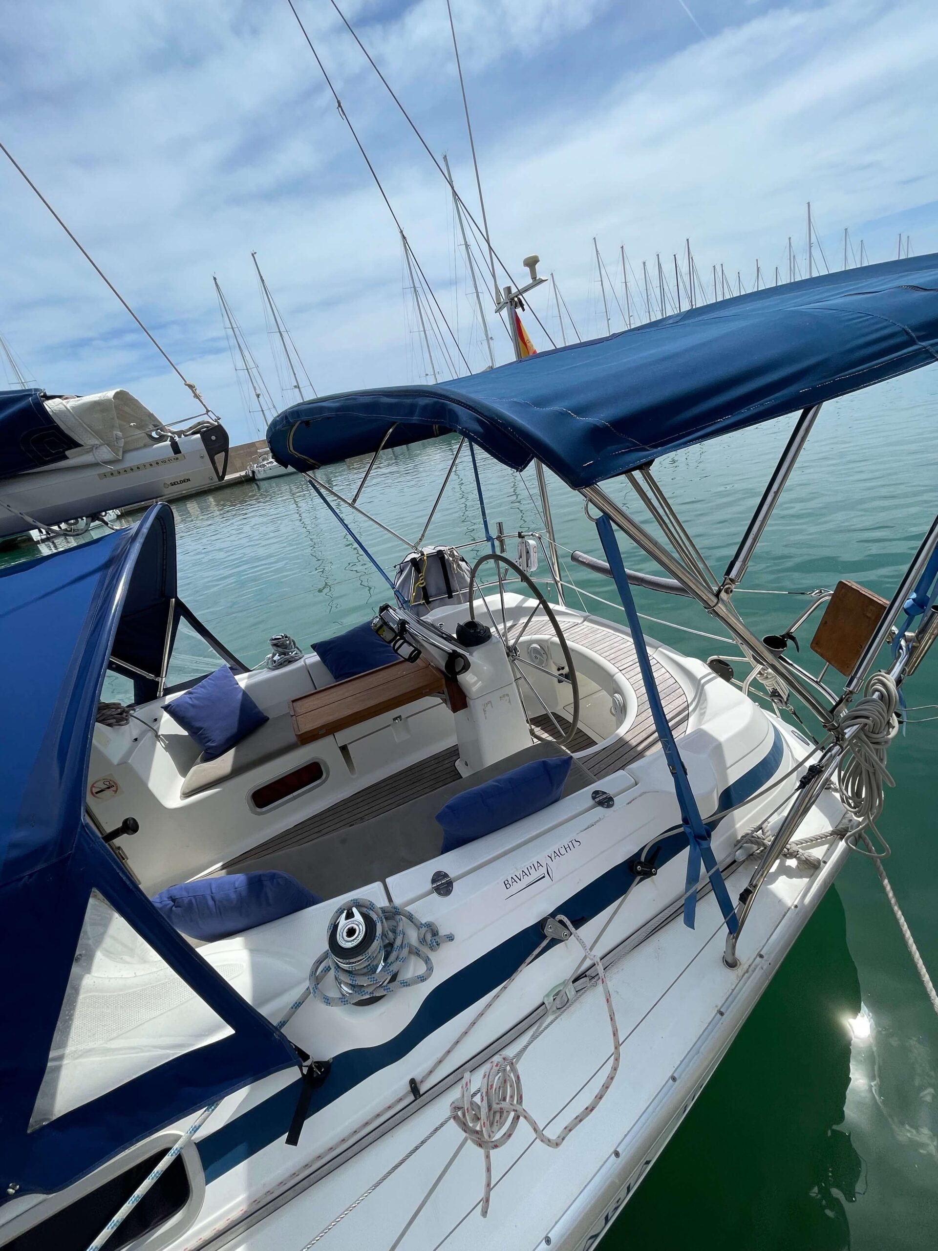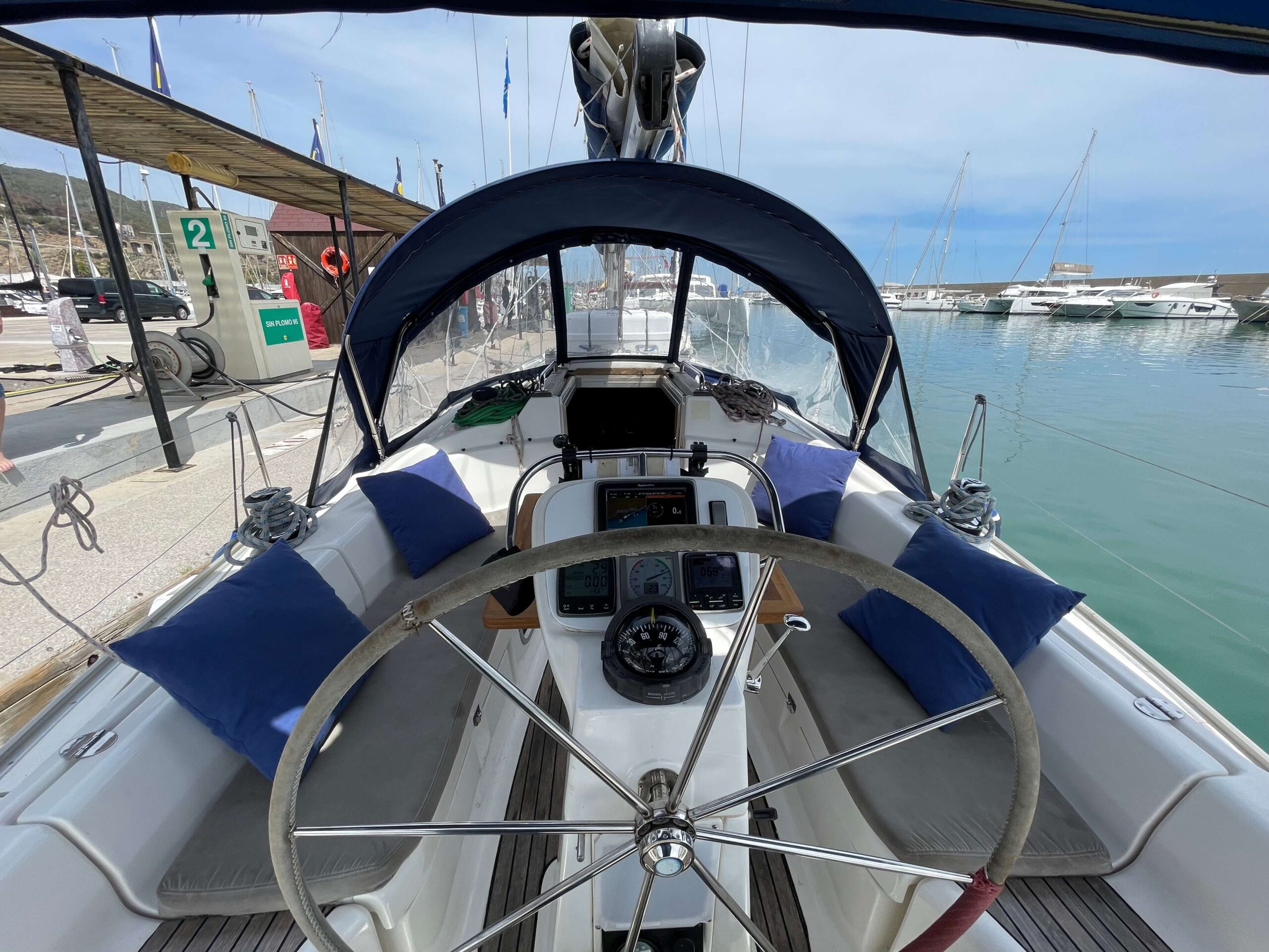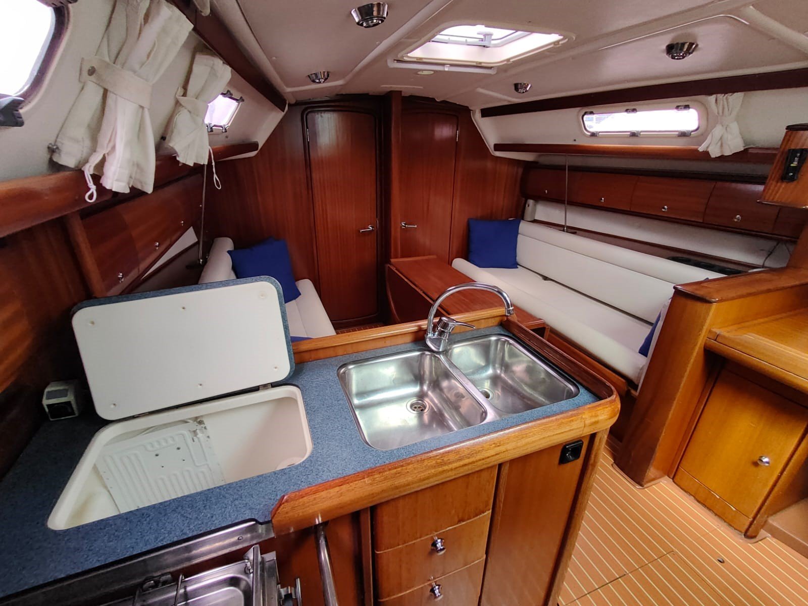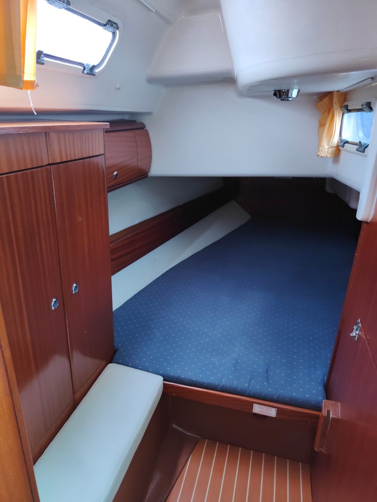 Velero de 11 metros de eslora con 3 camarotes y un baño, para navegar y pernoctar 8 personas cómodamente. Equipado con piloto automático, plotter en bañera, equipo de viento, sonda, AIS, VHF, radio con altavoces en interior y en bañera, cocina de gas basculante, molinete del ancla eléctrico con mando en cofre y en pulsador en bañera. Mayor con lazy-bag y con toda la cabuyería reenviada a bañera.