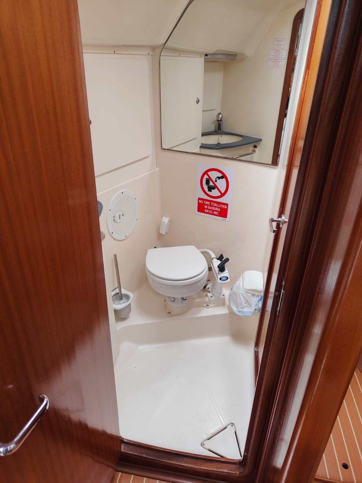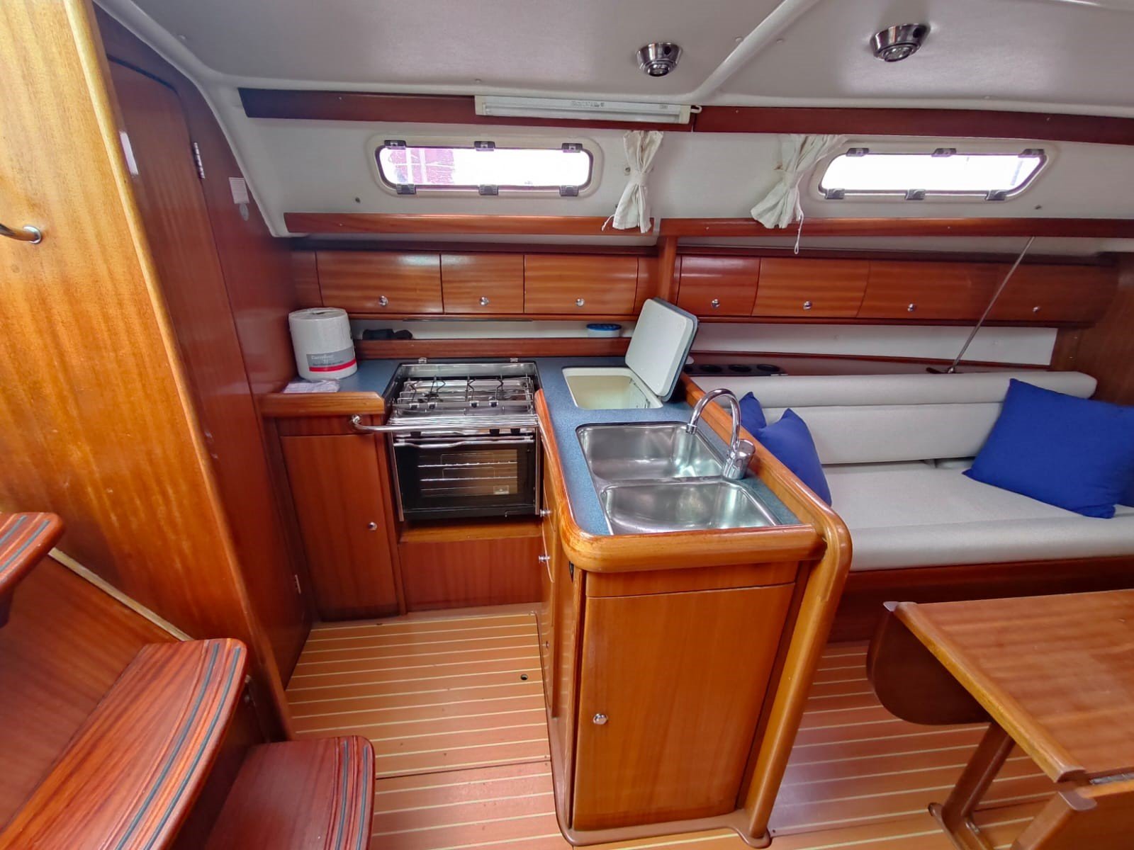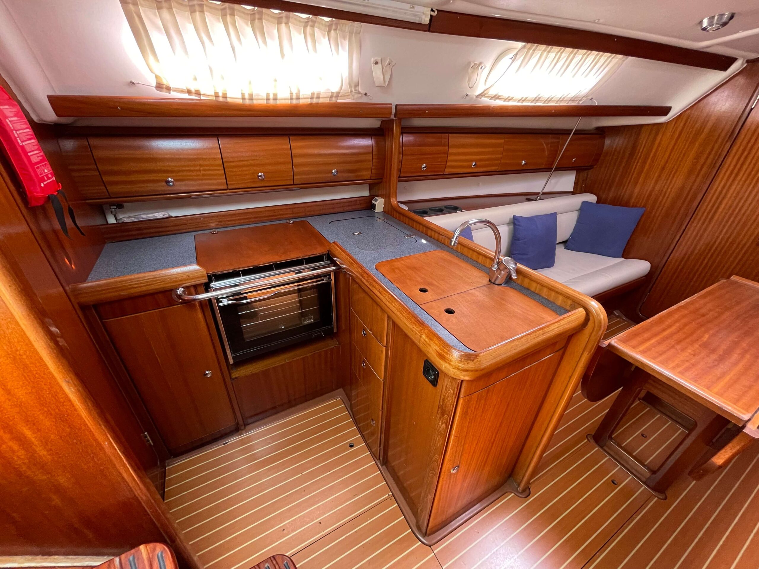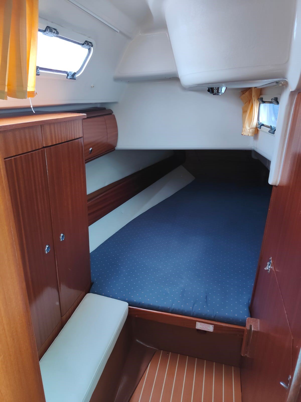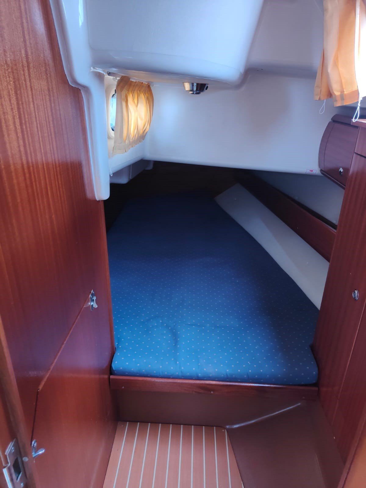 Velero de 11 metros de eslora con 3 camarotes y un baño, para navegar y pernoctar 8 personas cómodamente. Equipado con piloto automático, plotter en bañera, equipo de viento, sonda, AIS, VHF, radio con altavoces en interior y en bañera, cocina de gas basculante, molinete del ancla eléctrico con mando en cofre y en pulsador en bañera. Mayor con lazy-bag y con toda la cabuyería reenviada a bañera.